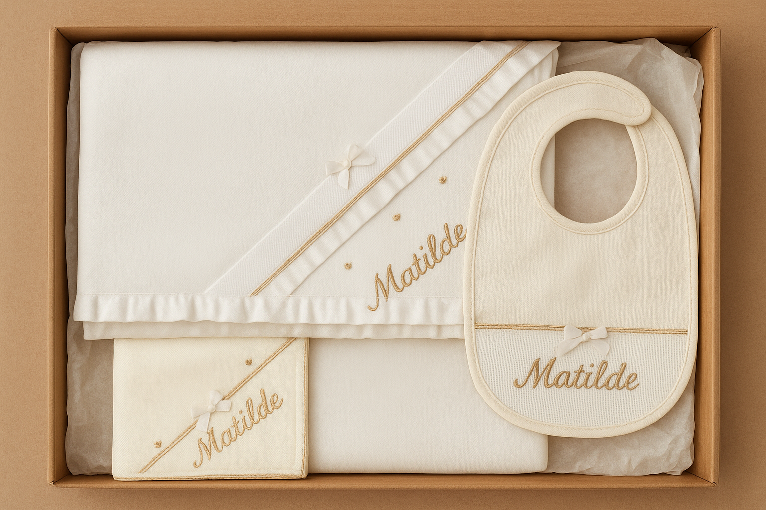 Pack Bordado Personalizado – Toalha, Fraldinha e Babete