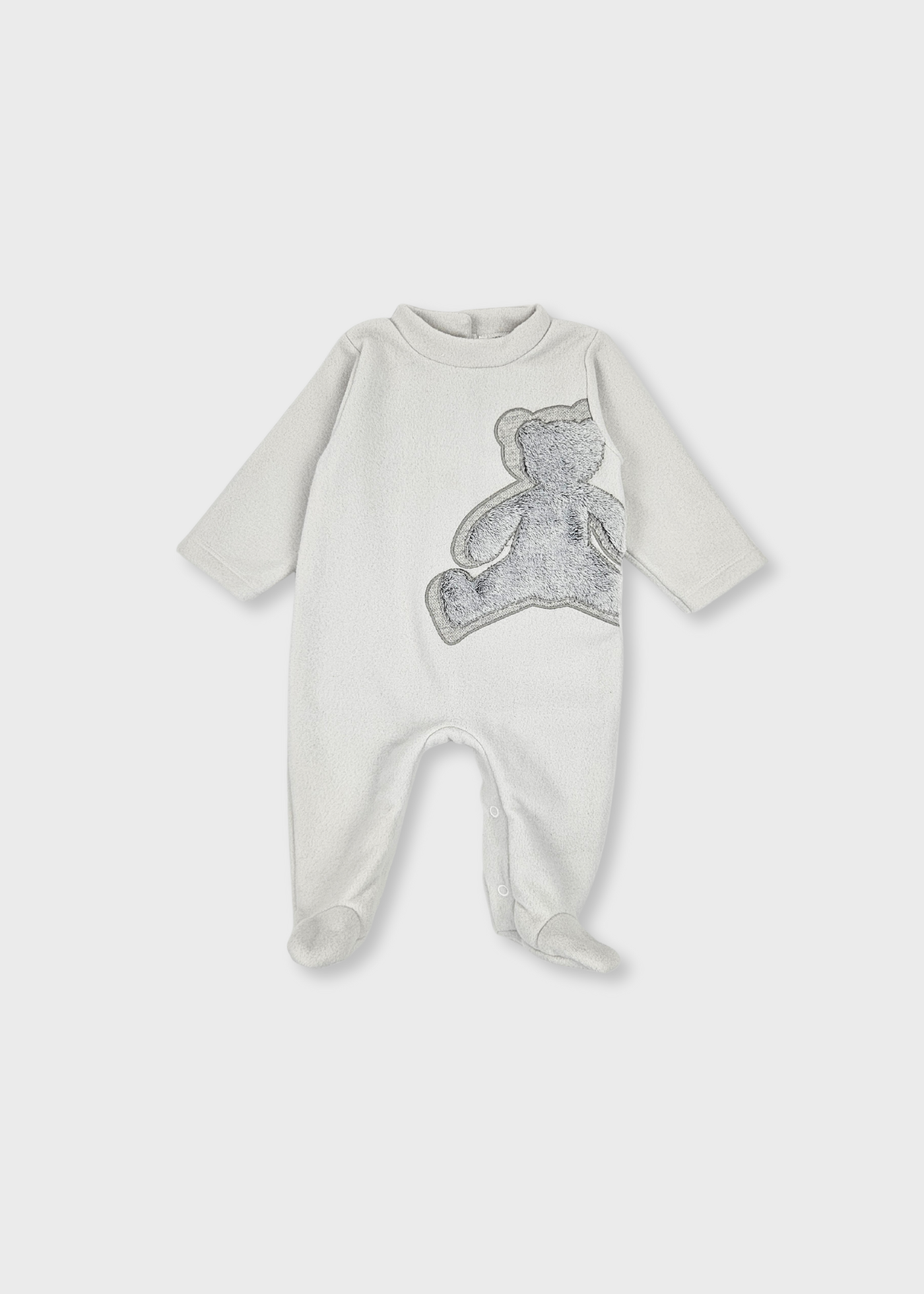 Babygrow em tecido cardado 100% algodão, suave e respirável, com ursinho em pelo bordado na lateral. O babygrow de bebé menino conta com botões de pressão nas costas e entre as pernas para vestir facilmente. Babygrow de bebé feito em Portugal, com algodão confortável para o bem estar do bebé.