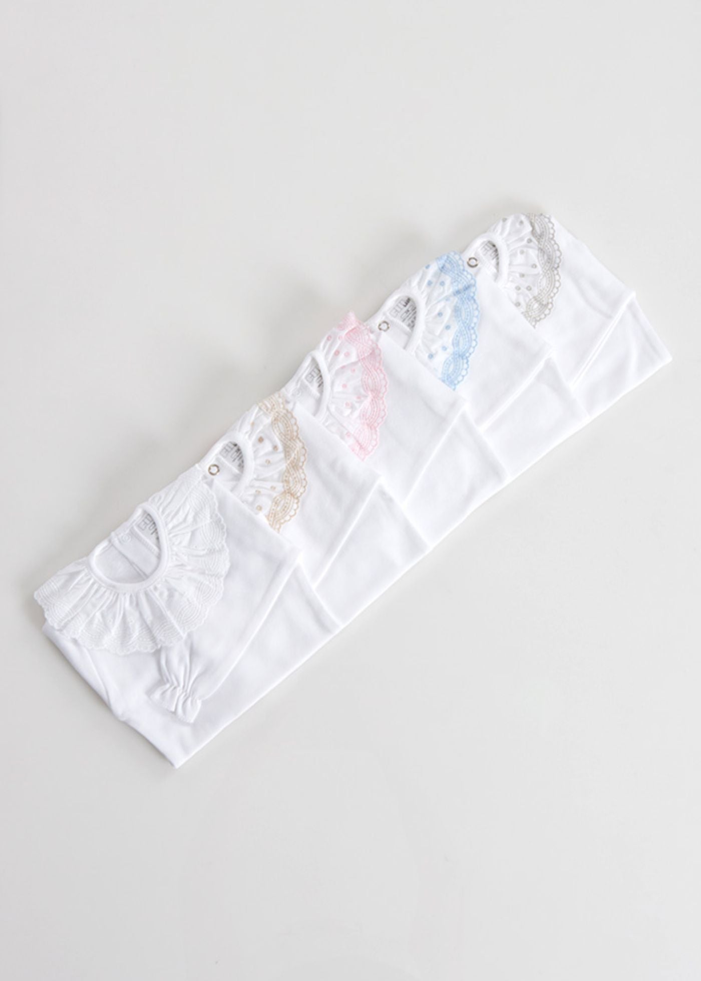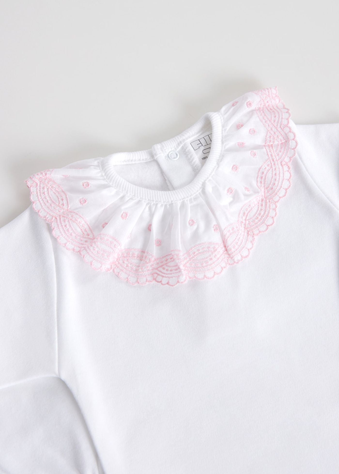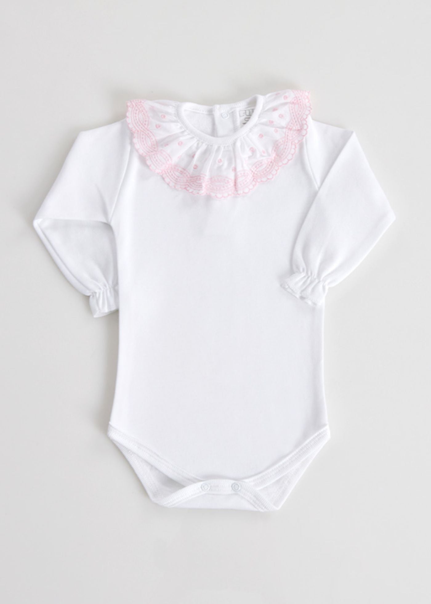 Este body de bebé menina em algodão cardado é a escolha perfeita para manter a sua bebé confortável e quentinha nos dias mais frescos. Com um design delicado em branco e gola com detalhes bordados, combina elegância e suavidade numa peça essencial do dia a dia.