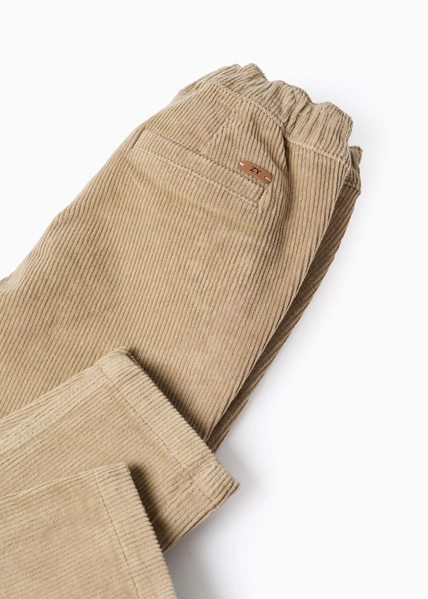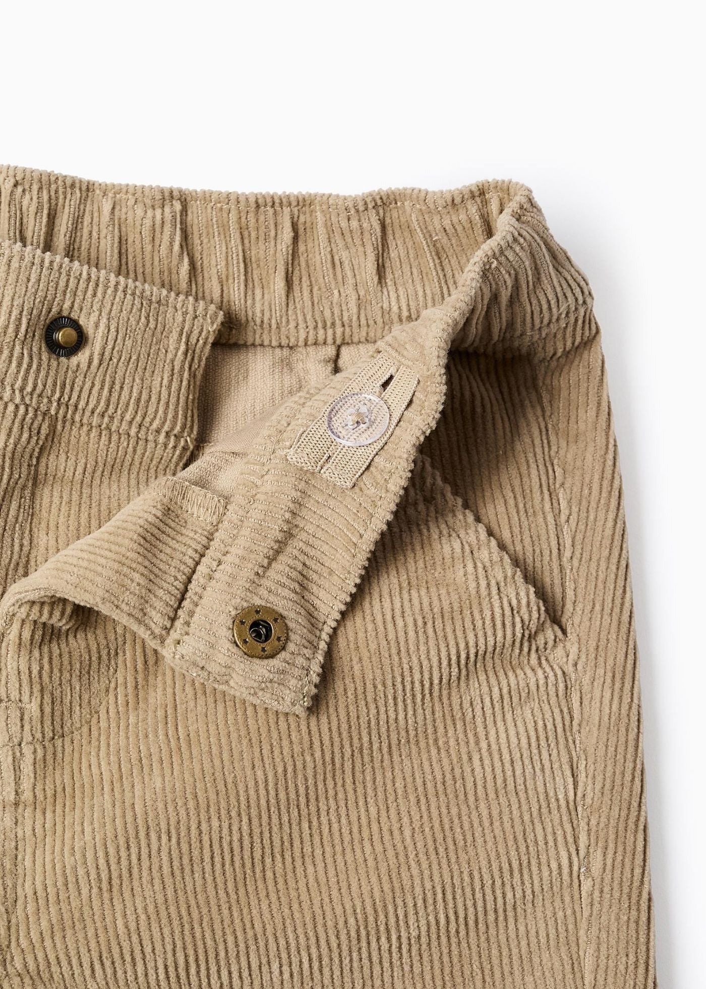 Calças chino de bombazine bege para bebé menino, em algodão com um toque de elasticidade para maior conforto e liberdade de movimentos. Bolsos laterais funcionais e bolsos posteriores decorativos. Cintura elástica com botão de pressão, ajustável no interior com elásticos e botões. Um clássico do armário, ideal para os meses de outono-inverno.