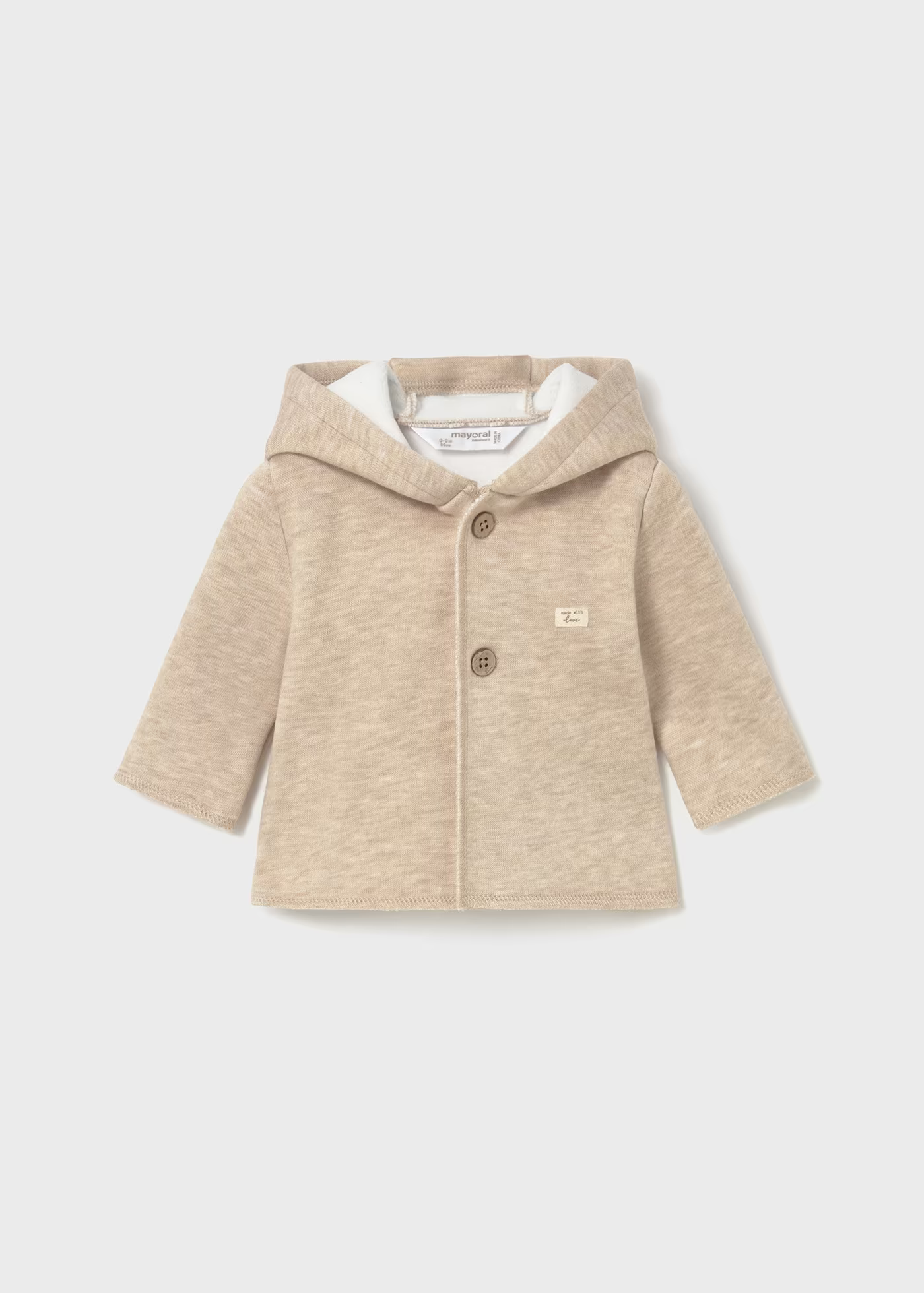 Casaco cardado de bebé, unisexo. Casaco com capuz cardado. Casaco de bebé com botão. Casaco da mayoral para bebé. O casaco combina com diversos looks de bebé.