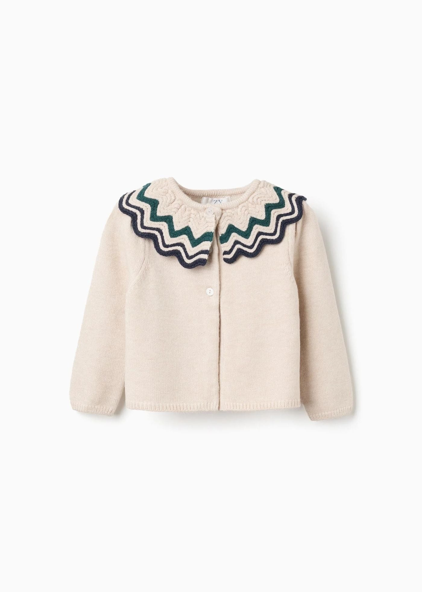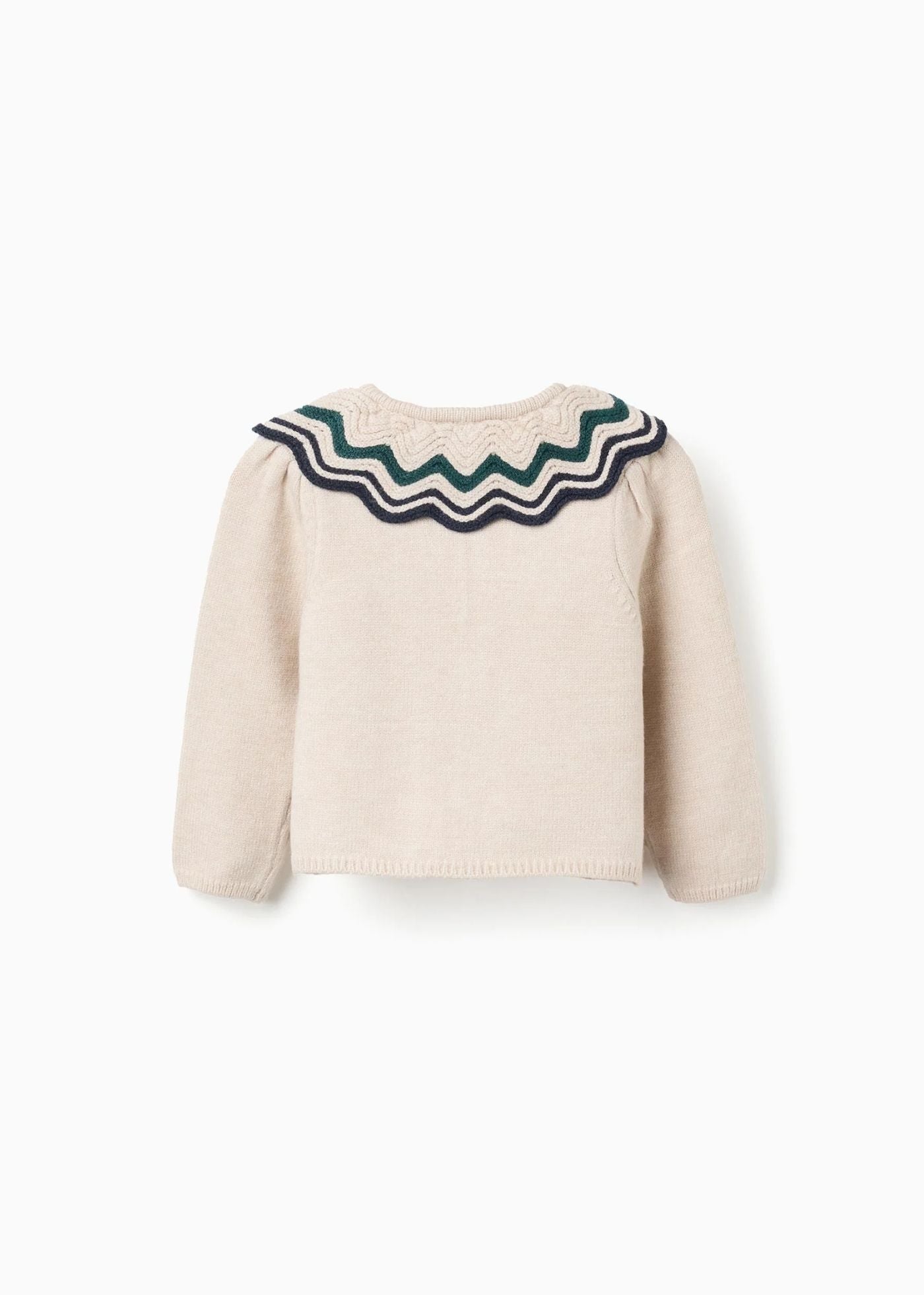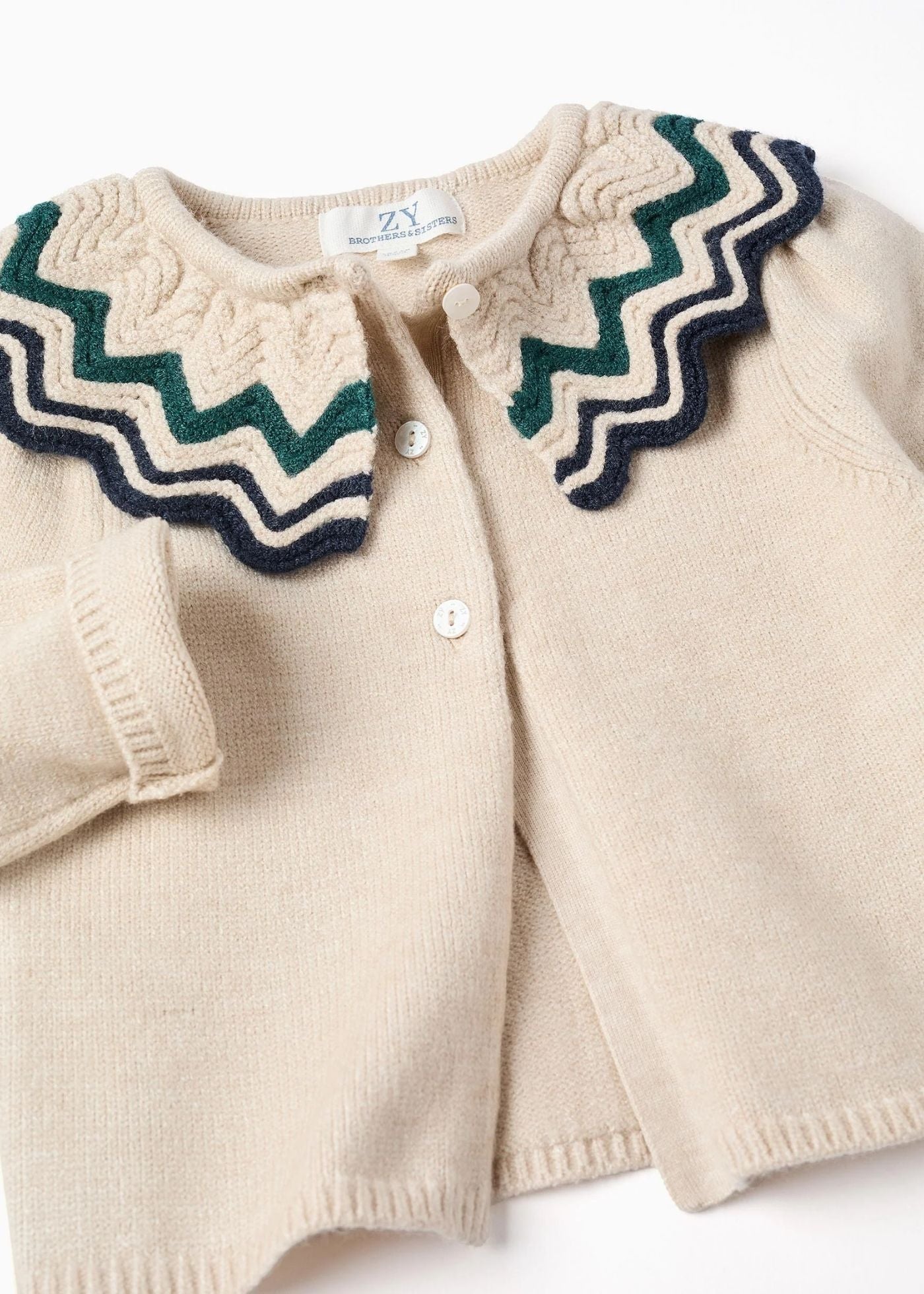 Este casaco de malha bege é a peça perfeita para a sua bebé menina, combinando elegância e conforto. Com uma gola maxi e um acabamento ondulado em verde e azul-escuro, este casaco é ideal para adicionar um toque delicado aos looks da sua bebé.