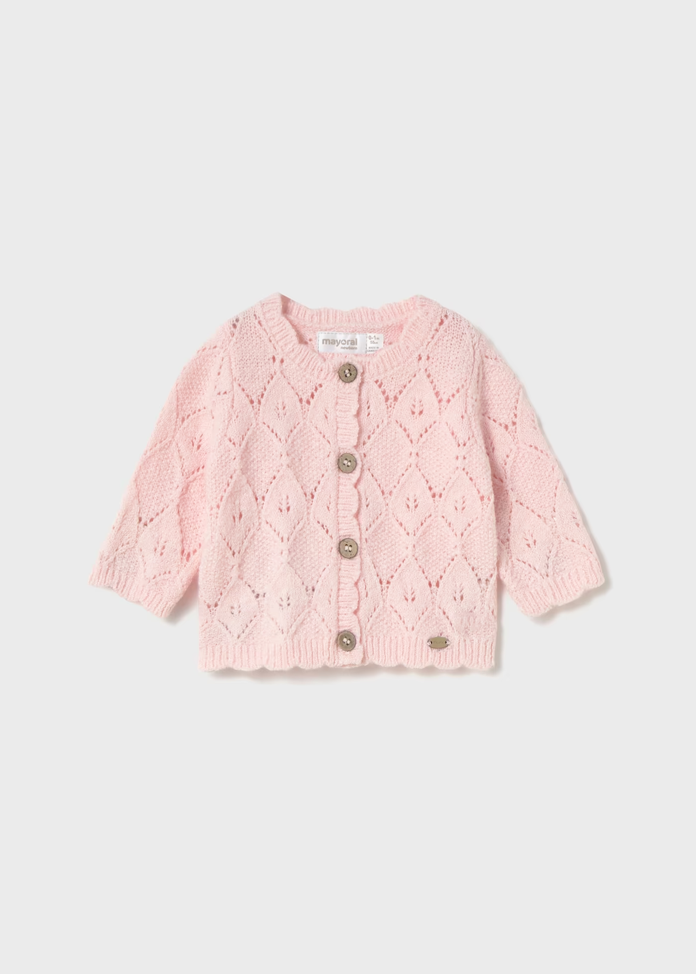 Casaco de bebé menina. Coleção mayoral newborn. Casaco com botão para mais conforto da bebé. Fácil de vestir.