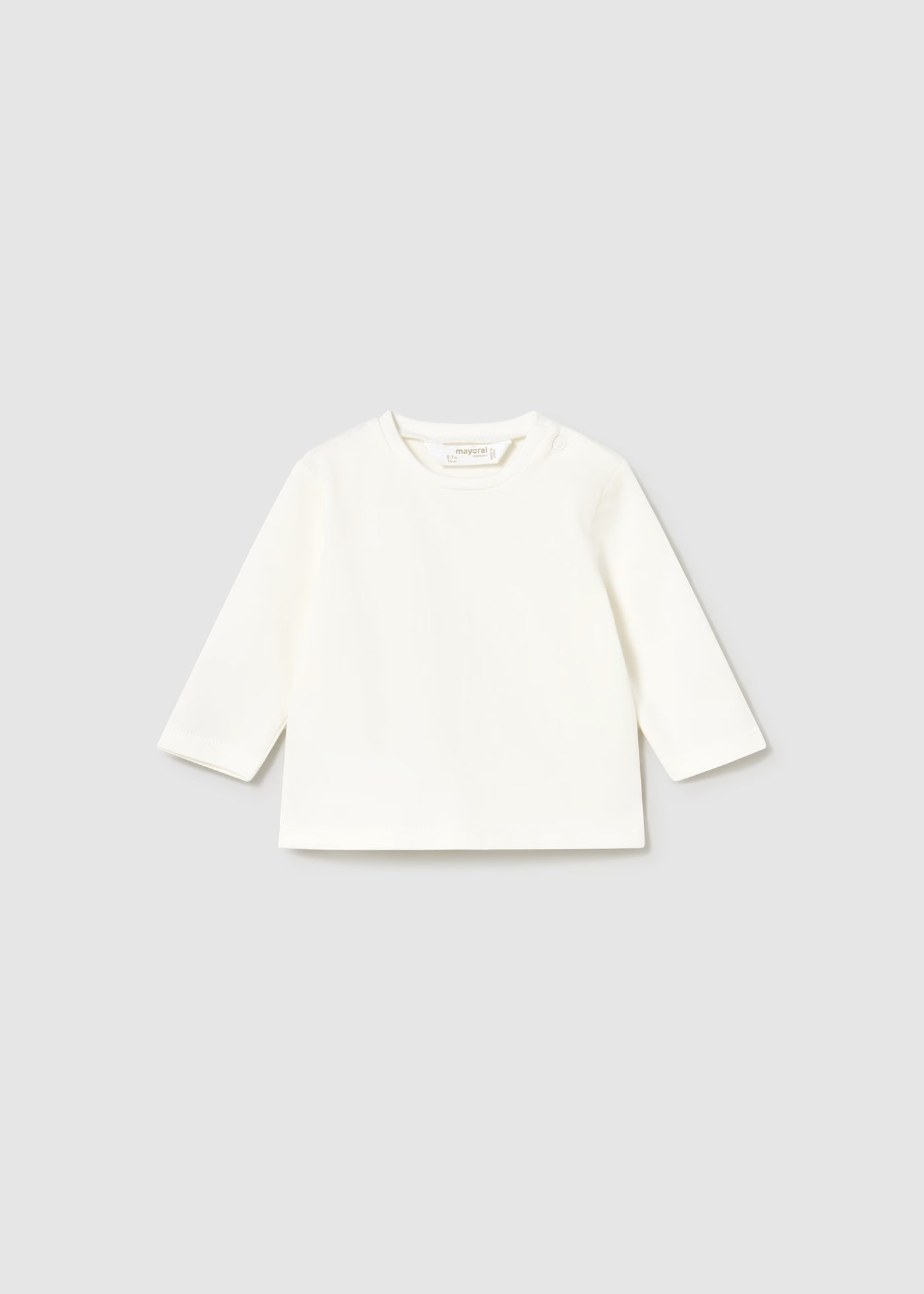 Camisola de manga comprida para recém nascido. Gola redonda. Botão de pressão na gola para facilitar a colocação da peça.