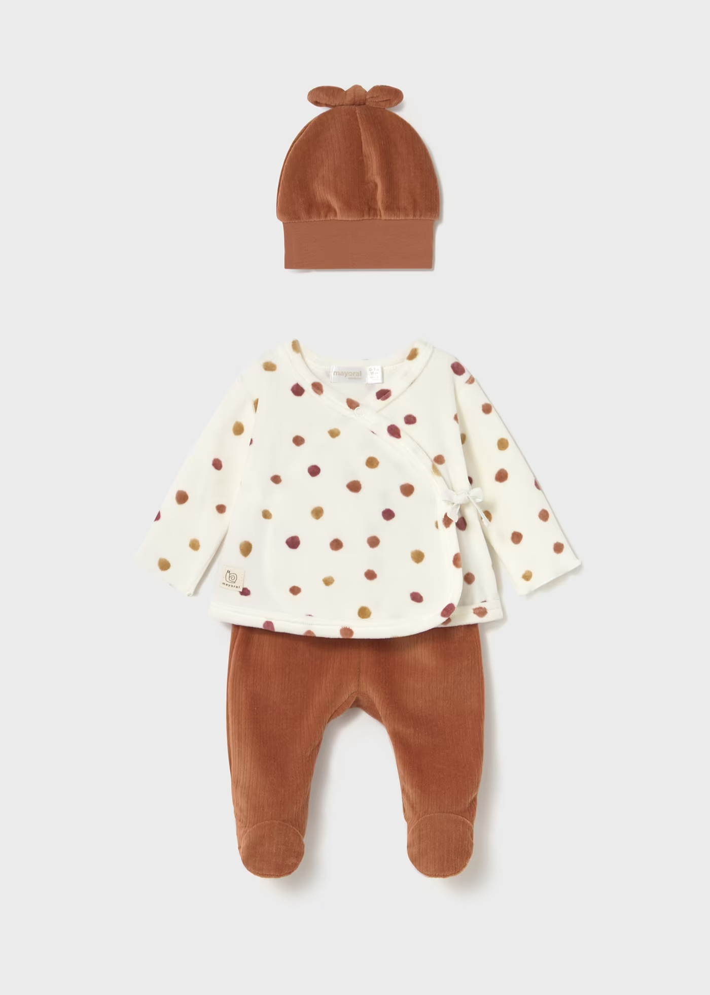 Conjunto 3 peças de bebé. Coleção mayoral. Calça de veludo. Camisa de trespasse para vestir facilmente. Gorro confortável.