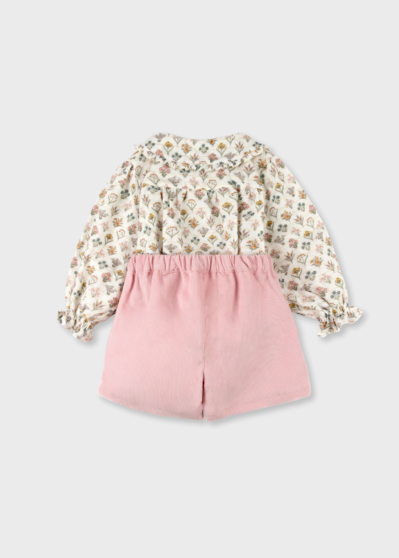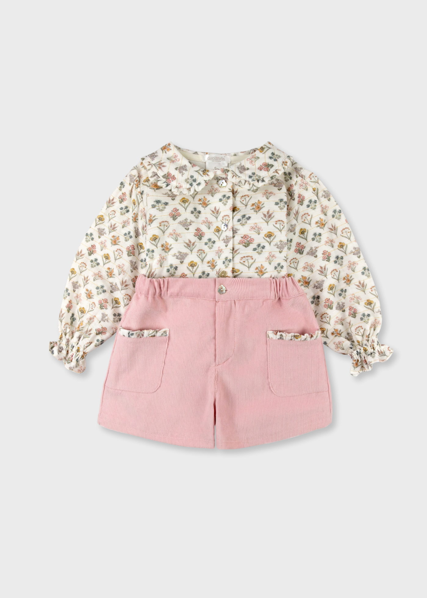 Calção em bombazine com bolsos na frente. O calção de bebé menina conta com botão e cintura elástica para melhor colocação. Calção com forro de algodão para melhor conforto.