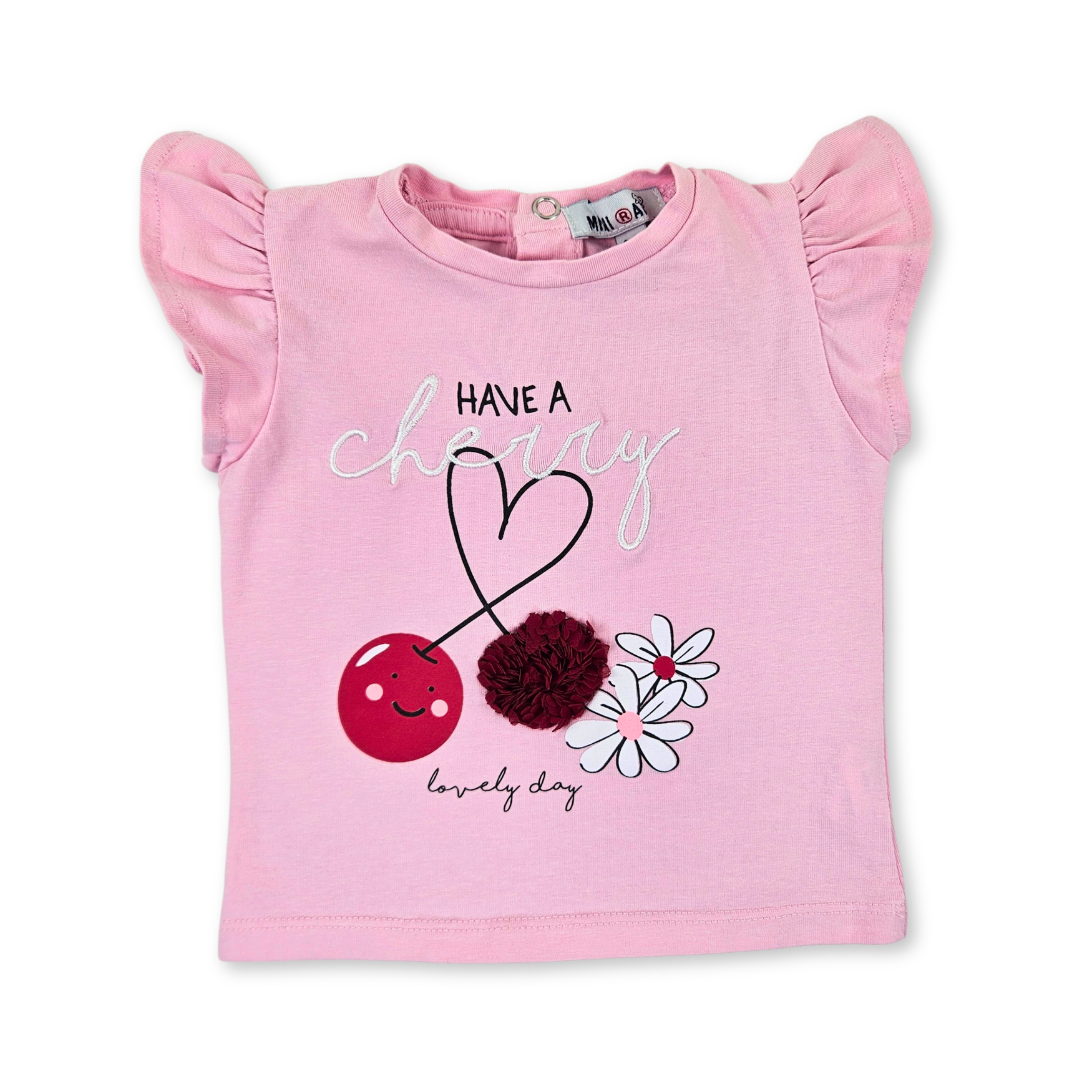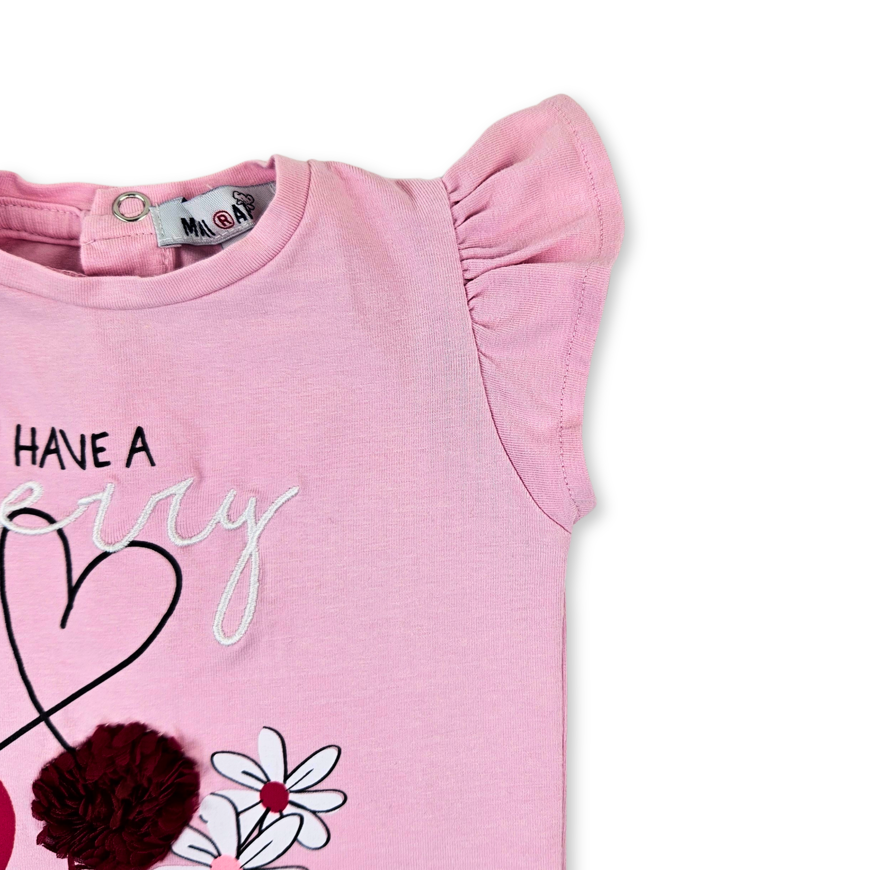 - T-shirt de bebé com manga cava e folho no ombro. Pequena abertura nas costas com botão para vestir fácilmente. Design bordado no centro