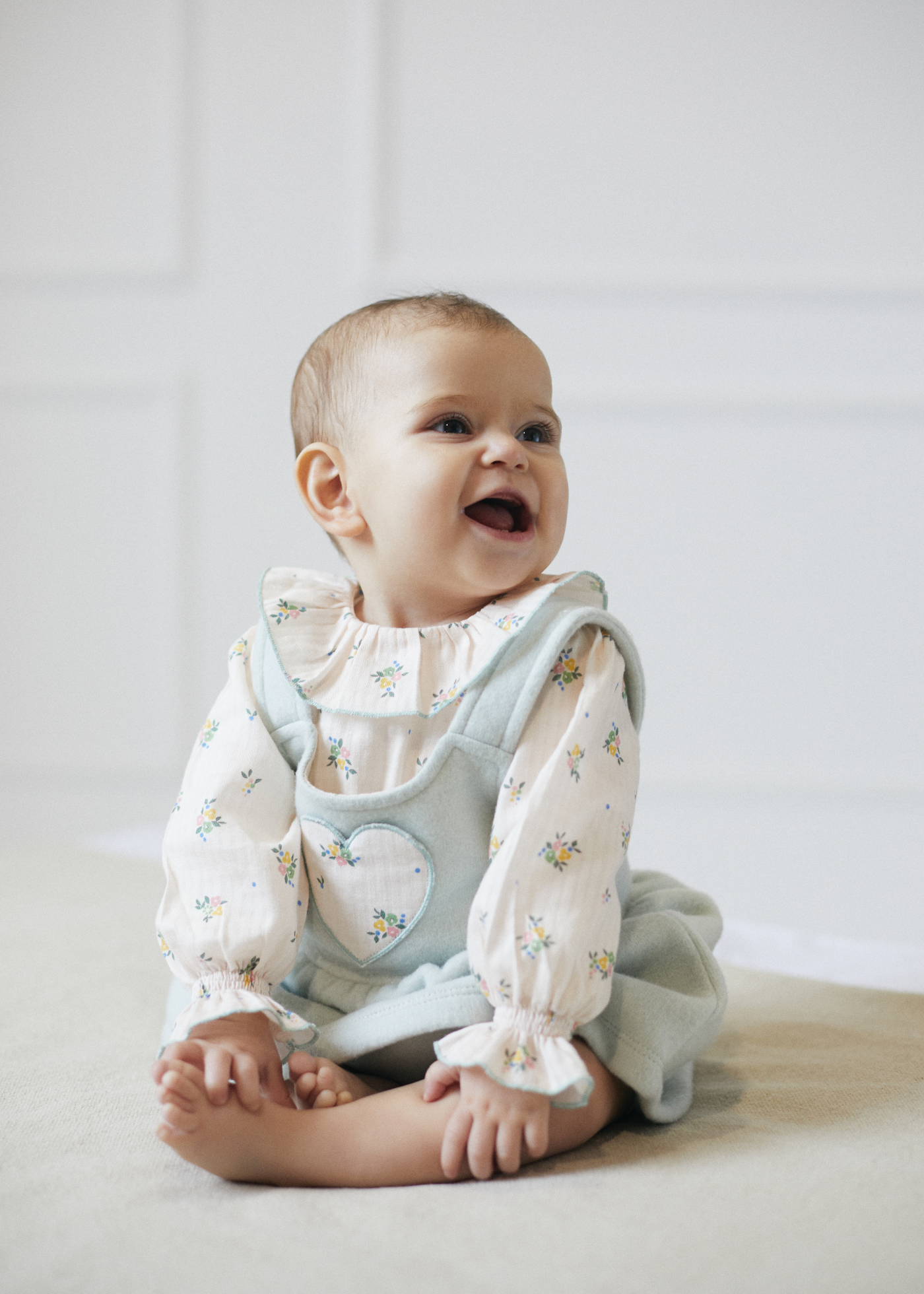 Vestido cardado de alças aplicação em forma de coração no peito, em tons suaves de verde. As alças permitem ser ajustadas o tamanho através dos botões em forma de coração que possui nas costas, também possui botões no comprimento das costas. Permite assim que seja prático de vestires a bebé e que a mantenham em segurança todo o dia!