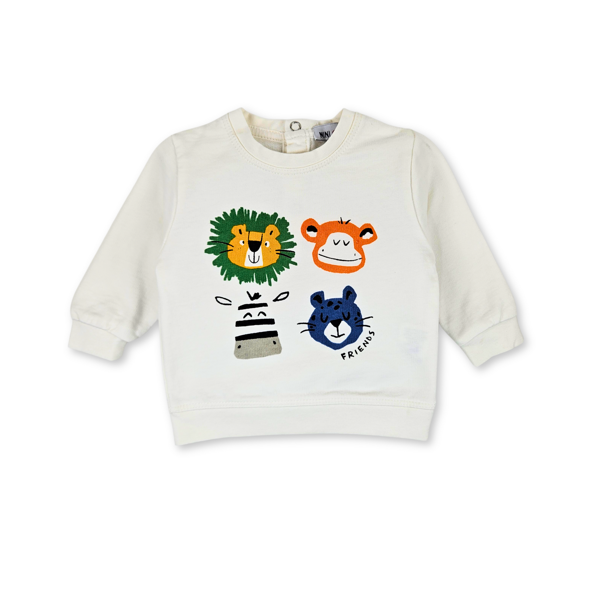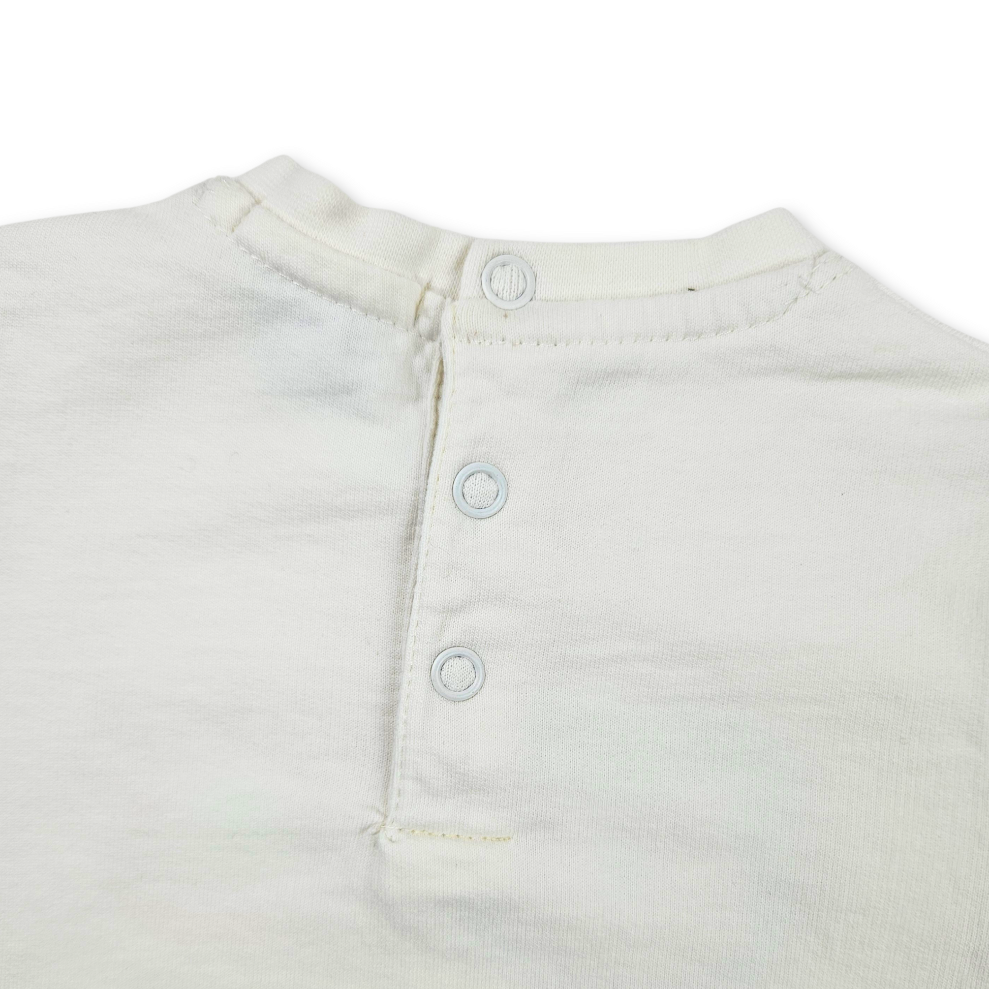 Sweat de menino com designe estampado no centro. A sweat de bebé conta com pequena abertura atrás e botão de pressão paras melhor colocação. A camisola mantém o bebé confortável com os punhos elásticos.