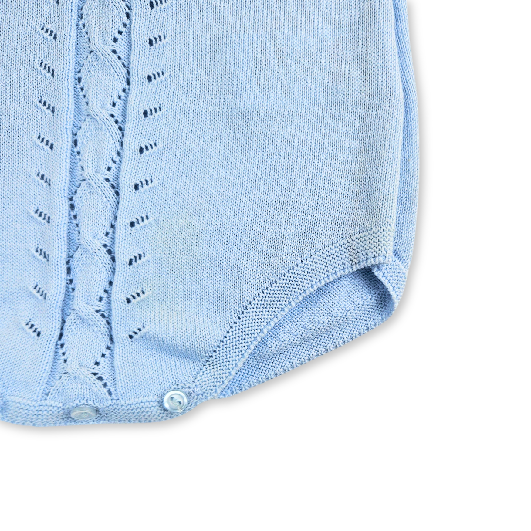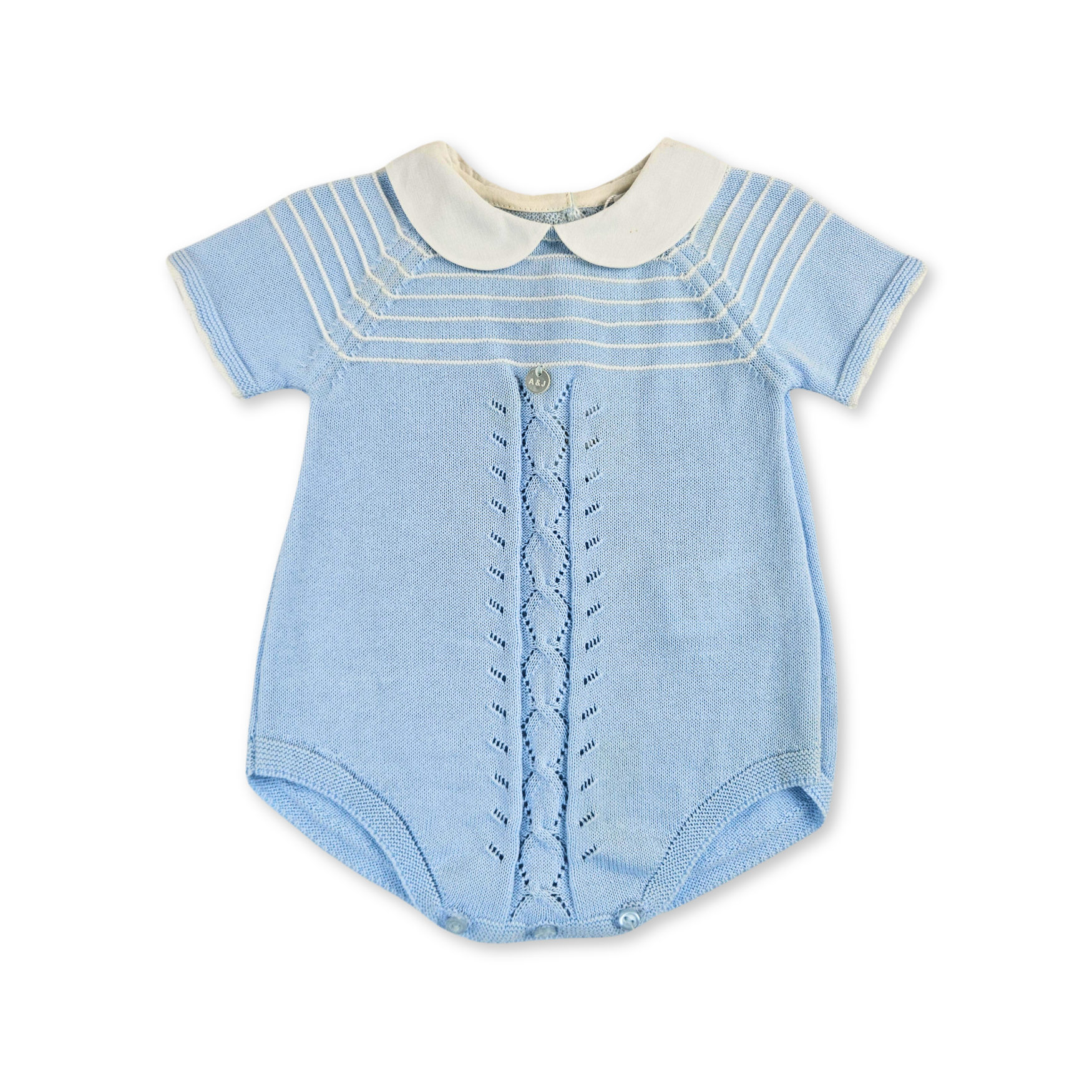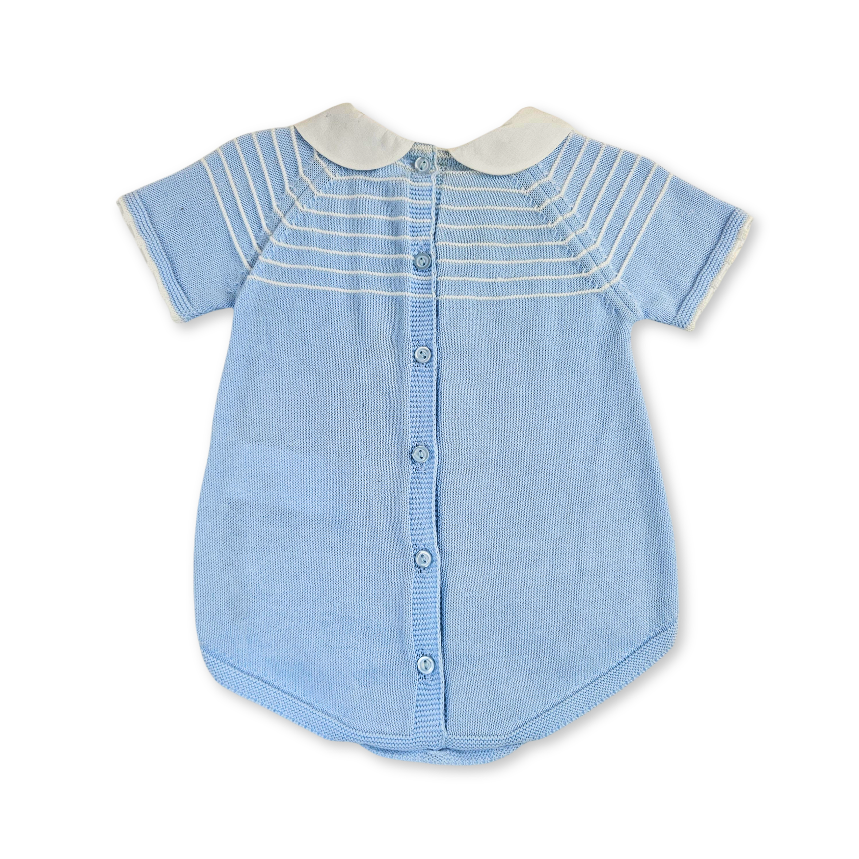 - Fofo de malha para bebé de manga curta com gola branca redonda. Botão na parte de trás e entrepernas para melhor colocação.