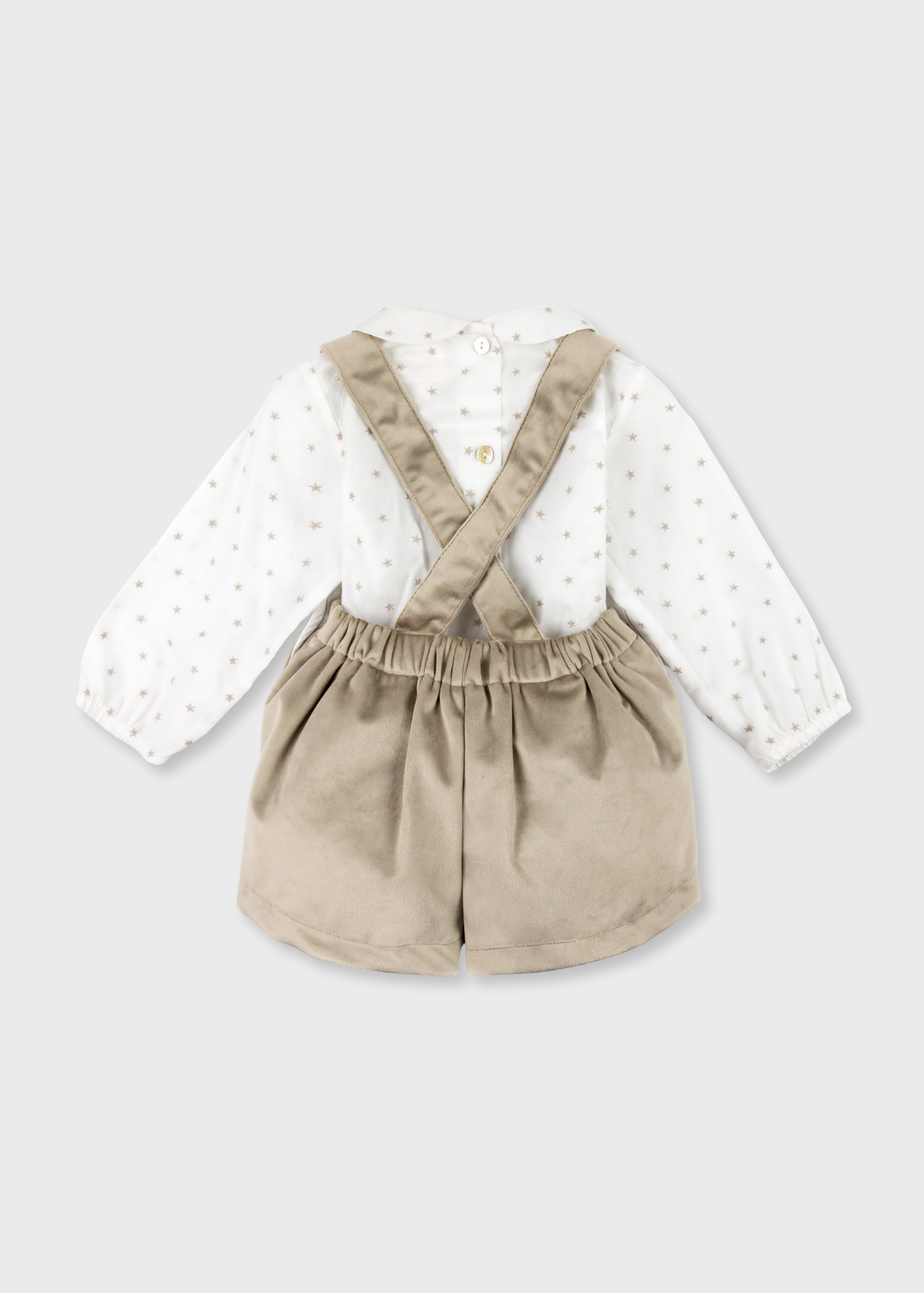 - Camisa branca com estrelas cinzentas bordadas, gola redonda e manga comprida com bordado no punho para manter confortável, aperta nas costas com botão.