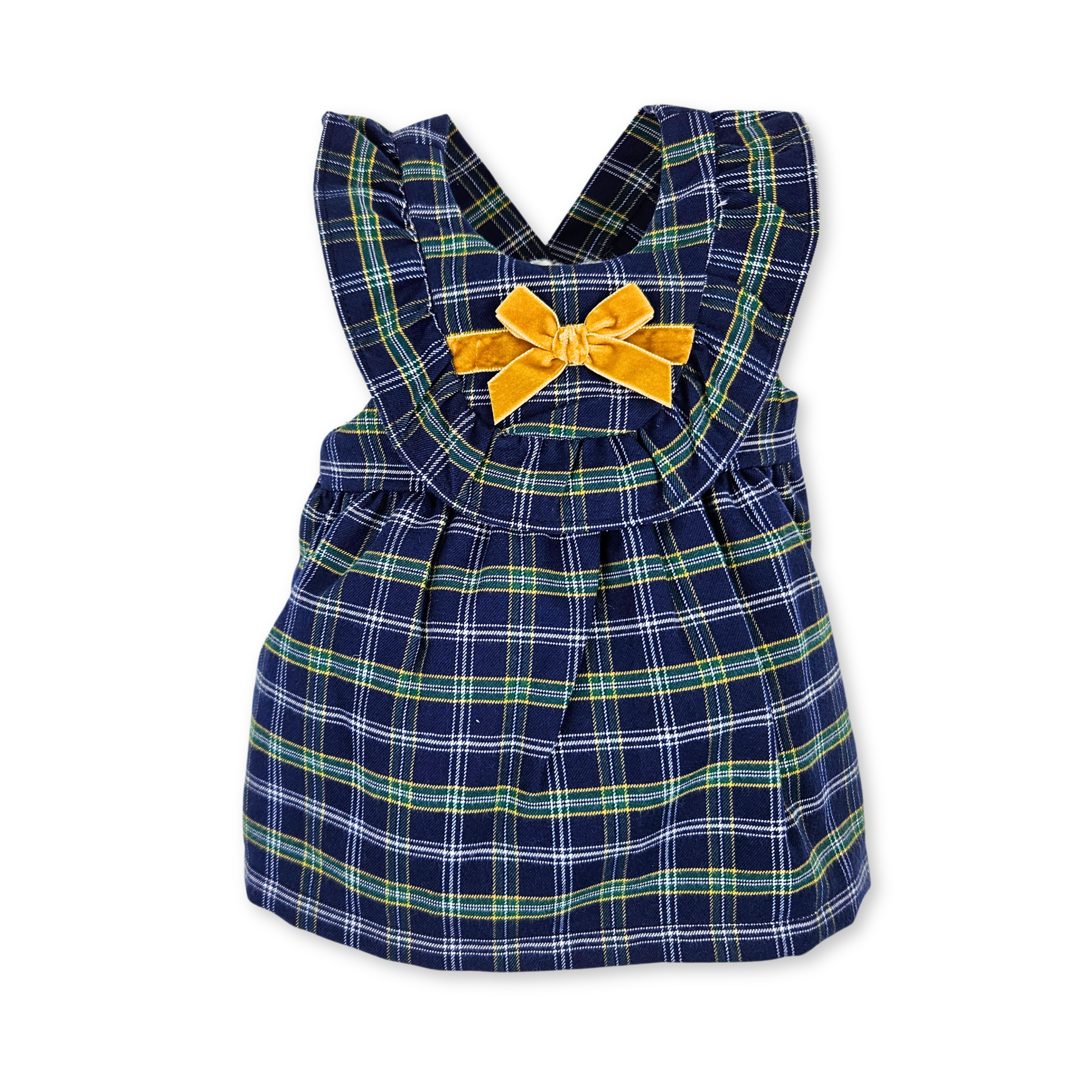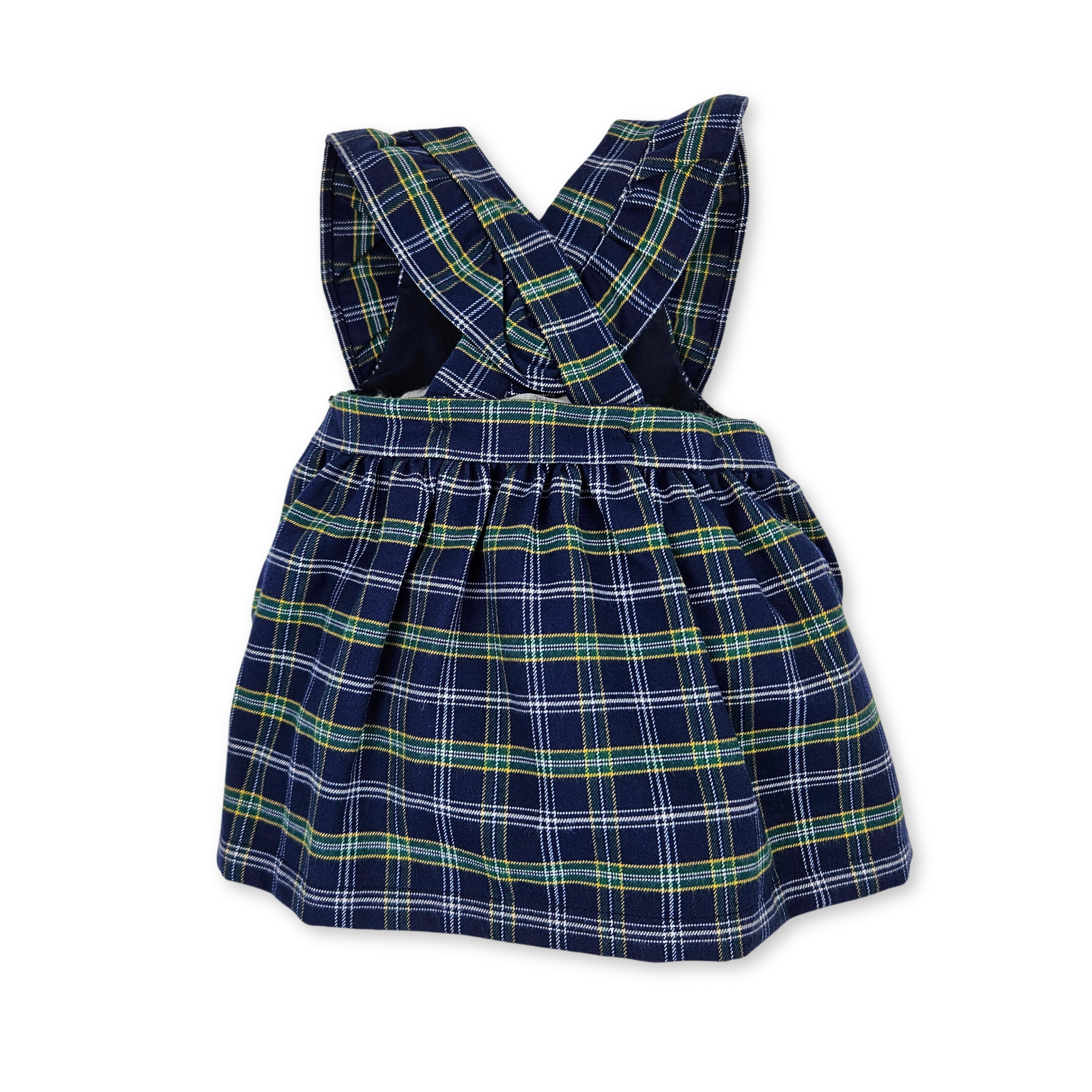 - Jardineira ao xadrez azul marinho com listas brancas e para tornar mais encantadora conta com laço no peito. Pode combinar com diversos Bodies ou Camisolas! Nas alças acrescenta folha do mesmo padrão.