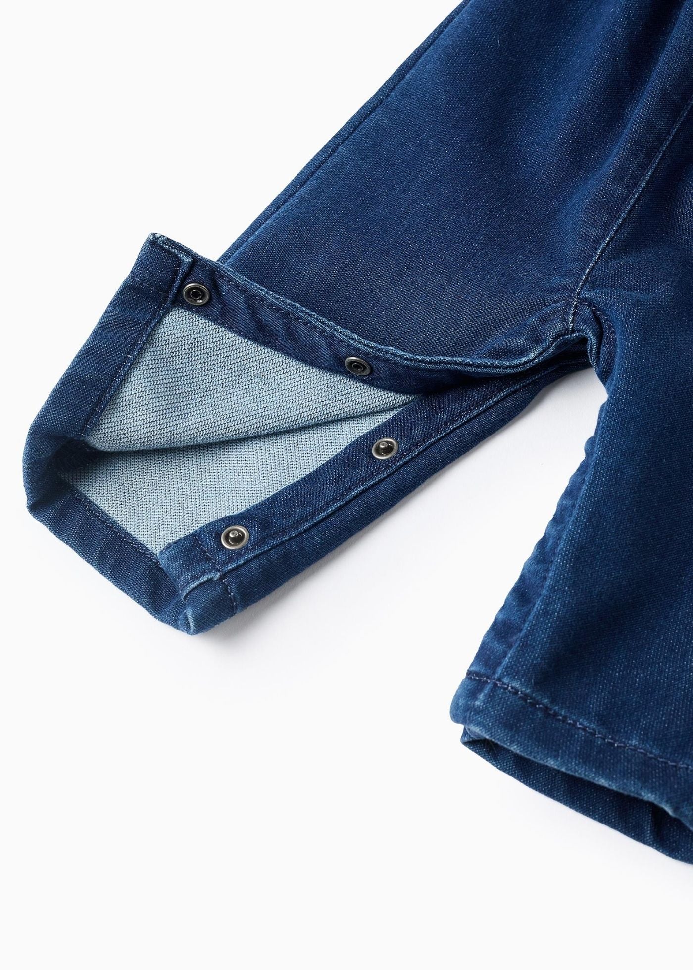Jardineiras de ganga azuis para recém-nascida, fabricadas em mistura de algodão suave e maleável. Alças ajustáveis e com folhos. Molas de pressão no entrepernas para facilitar a muda da fralda. Um essencial do armário!