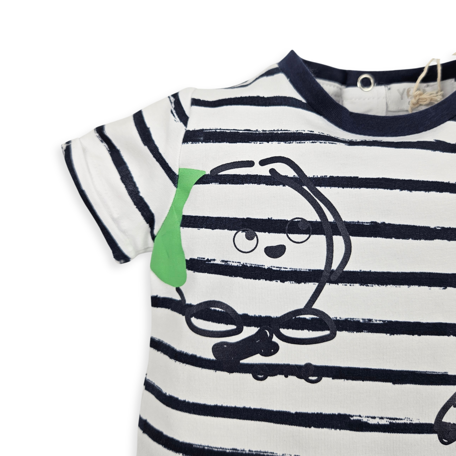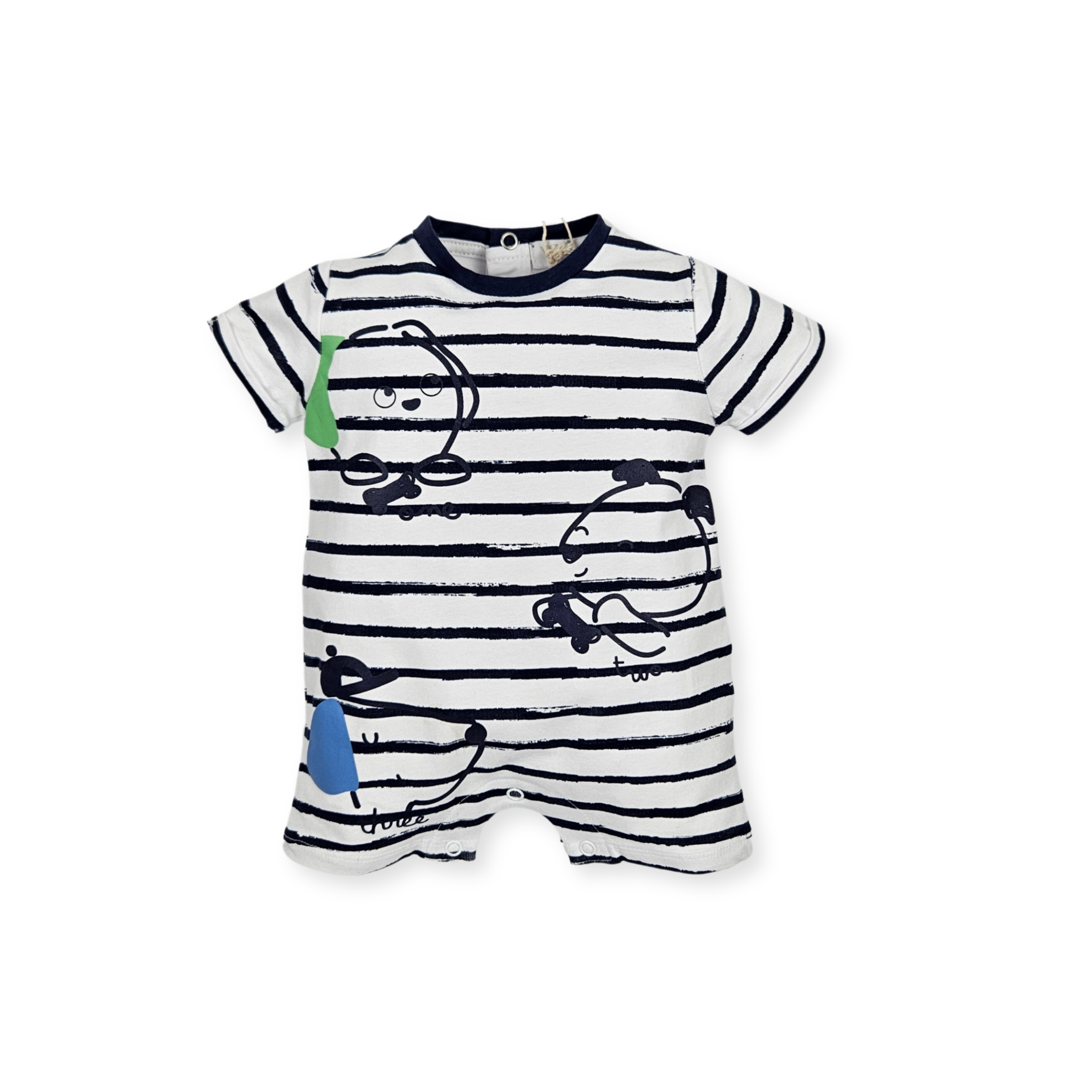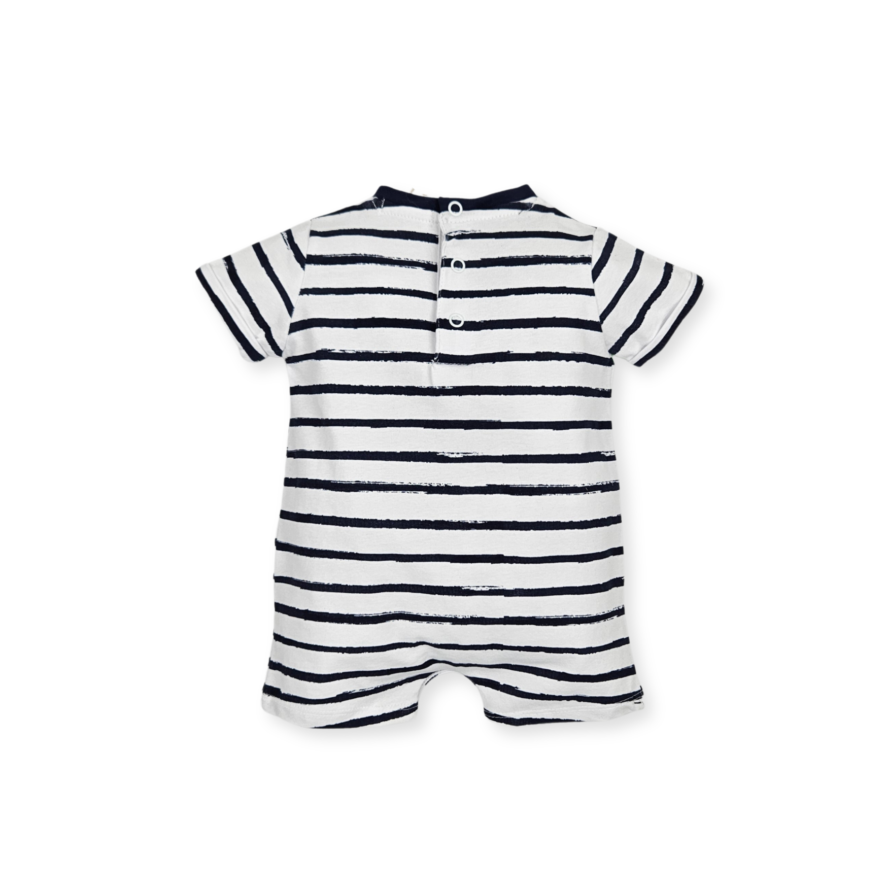 - Macacão de manga curta para menino. Aperta com botão de pressão na parte de trás e entrepernas para facilitar a colocação da peça. Estampado de riscas.