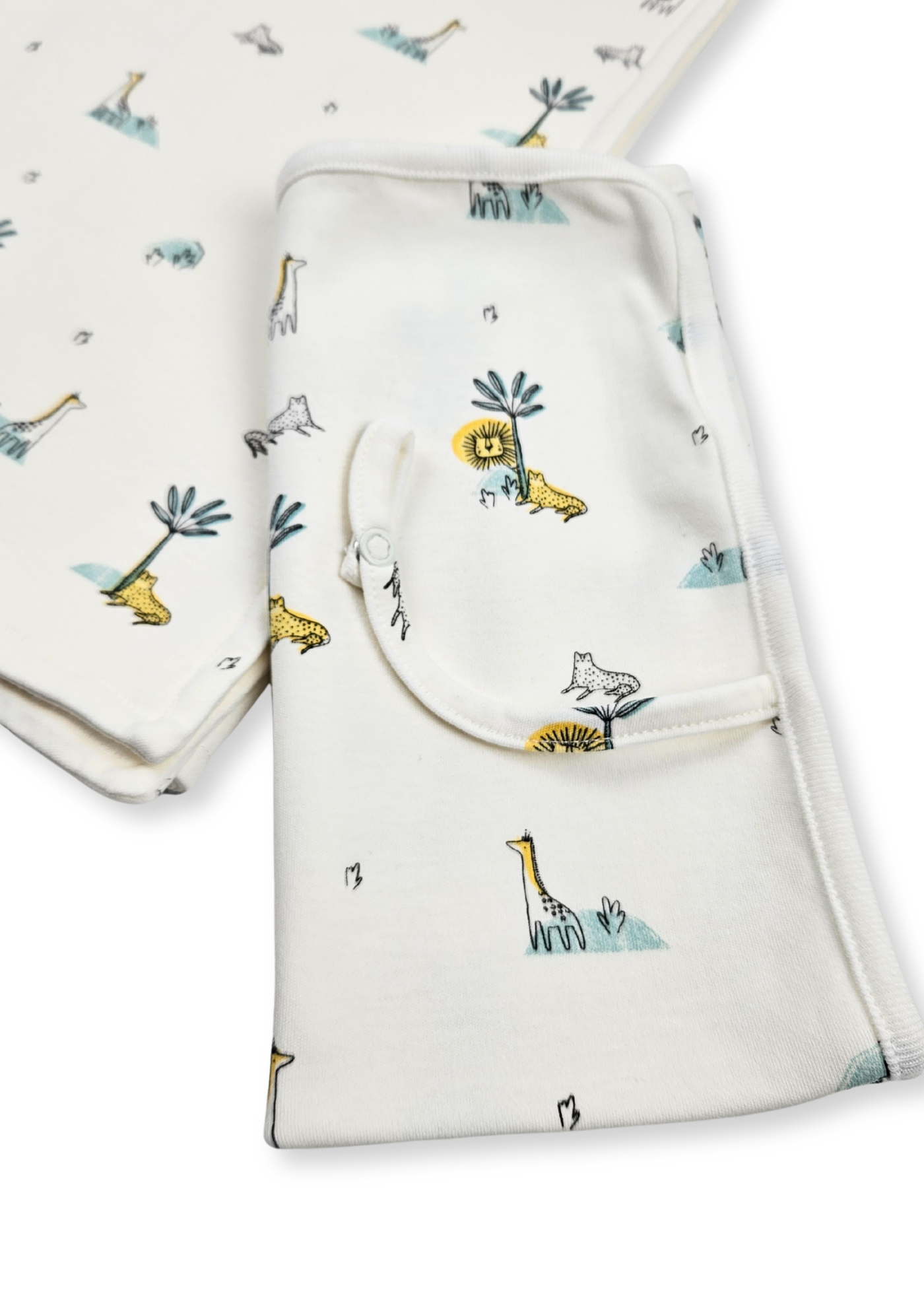 Fralda de algodão, com designe da selva num lado. A fralda de algodão conta com prende chupeta.