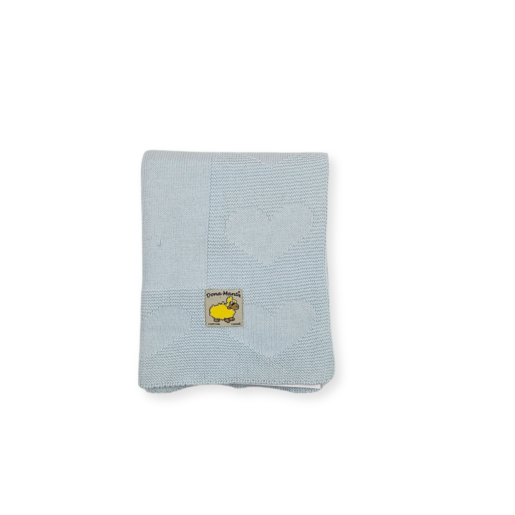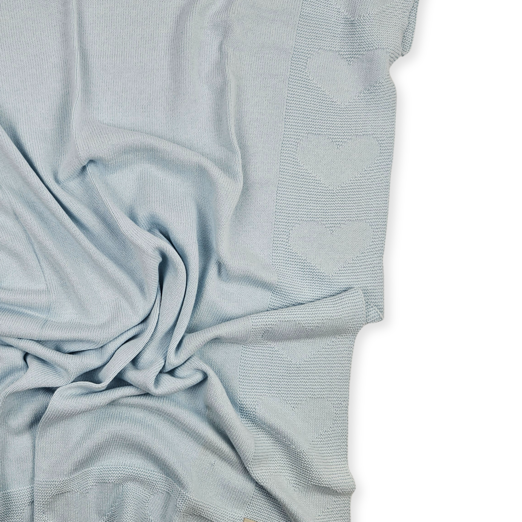 - Manta tricotada quadrada azul bebé, com corações bordados em volta.
