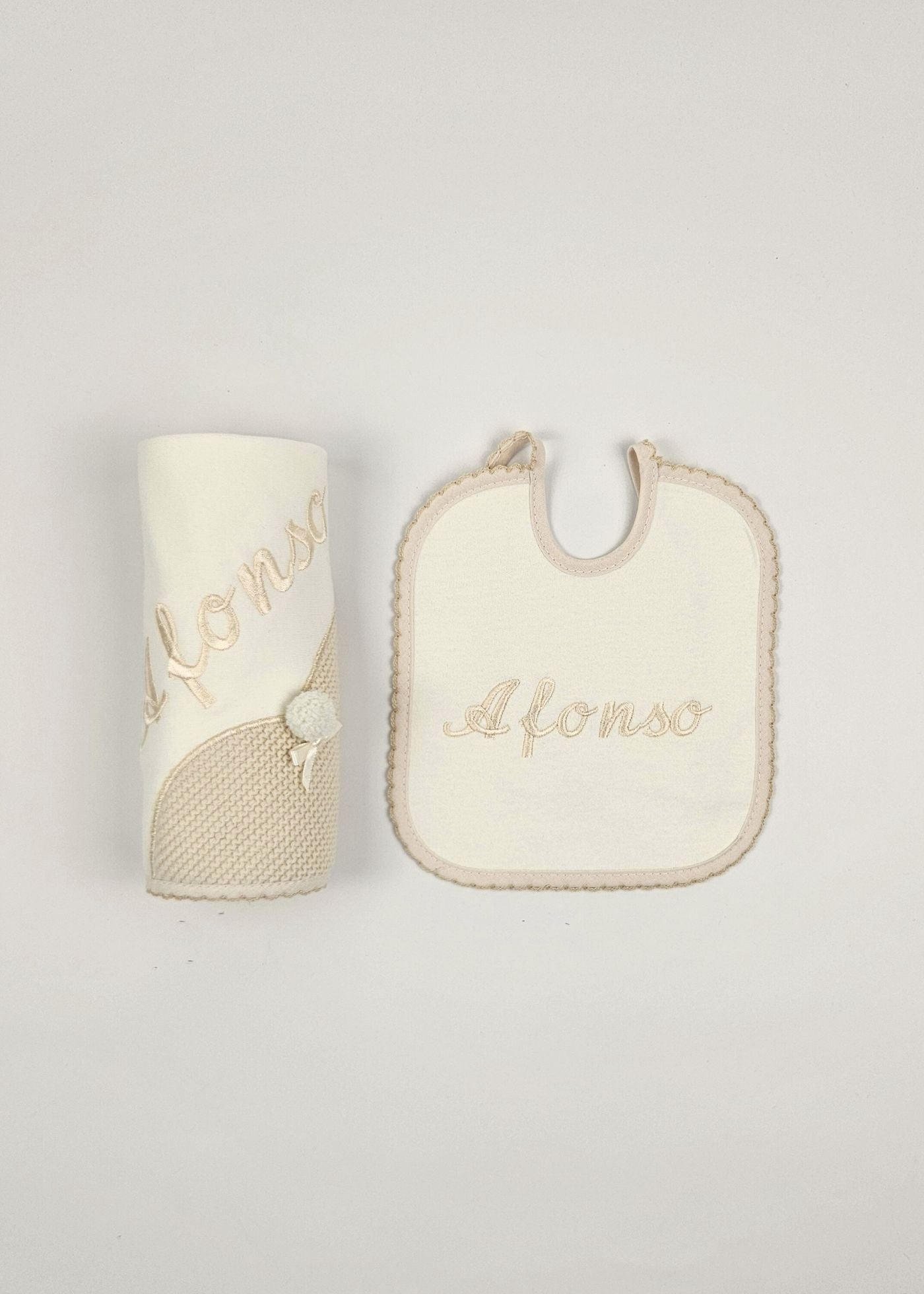 Este pack inclui fraldinha e babete, todos personalizados com bordado do nome do bebé, criando um conjunto único, prático e cheio de ternura.