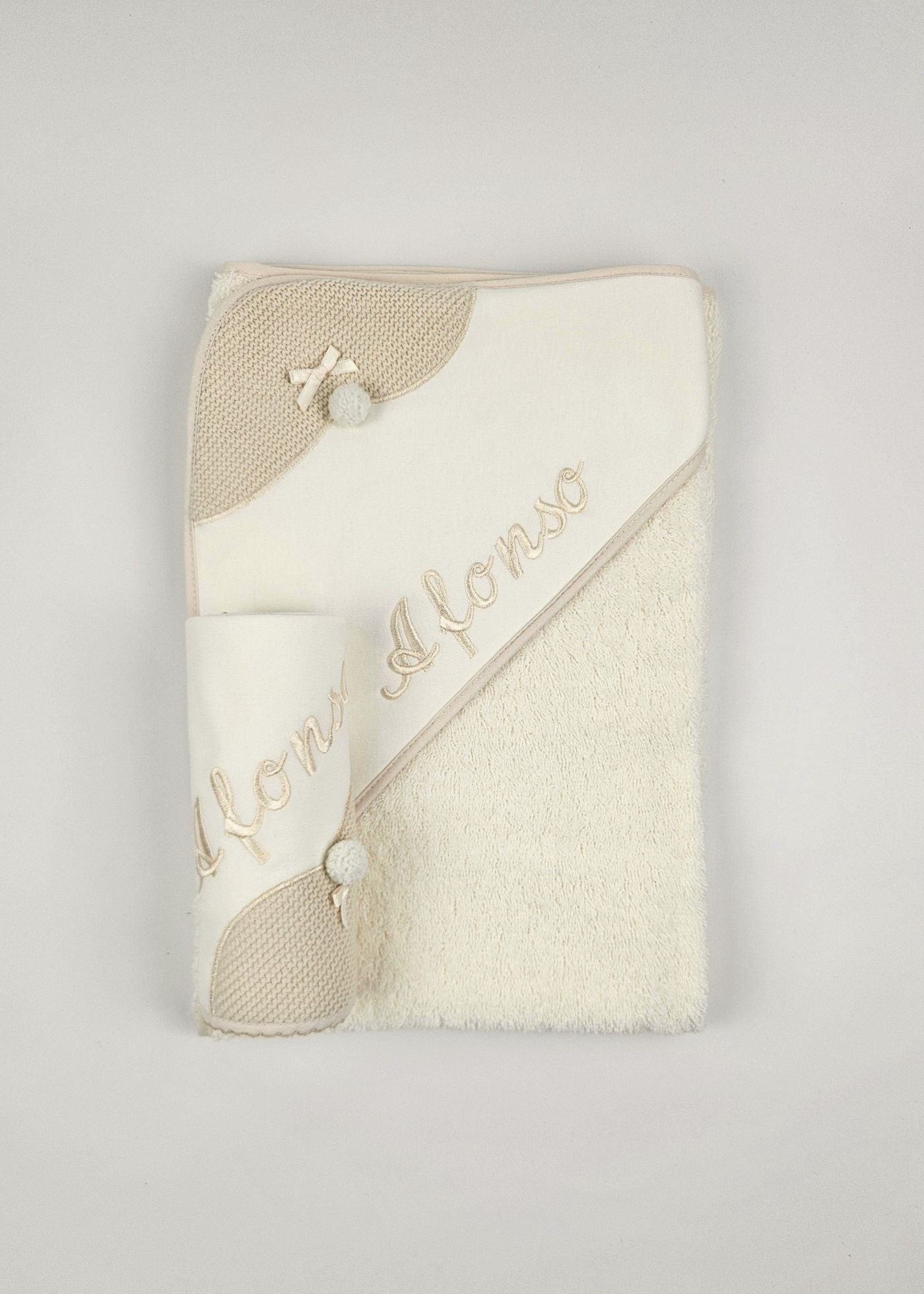 Características: Pack de duas peças com bordado personalizado. Inclui bordados. Toalha com capuz de bebé. Fraldinha de algodão para o dia a dia do bebé.