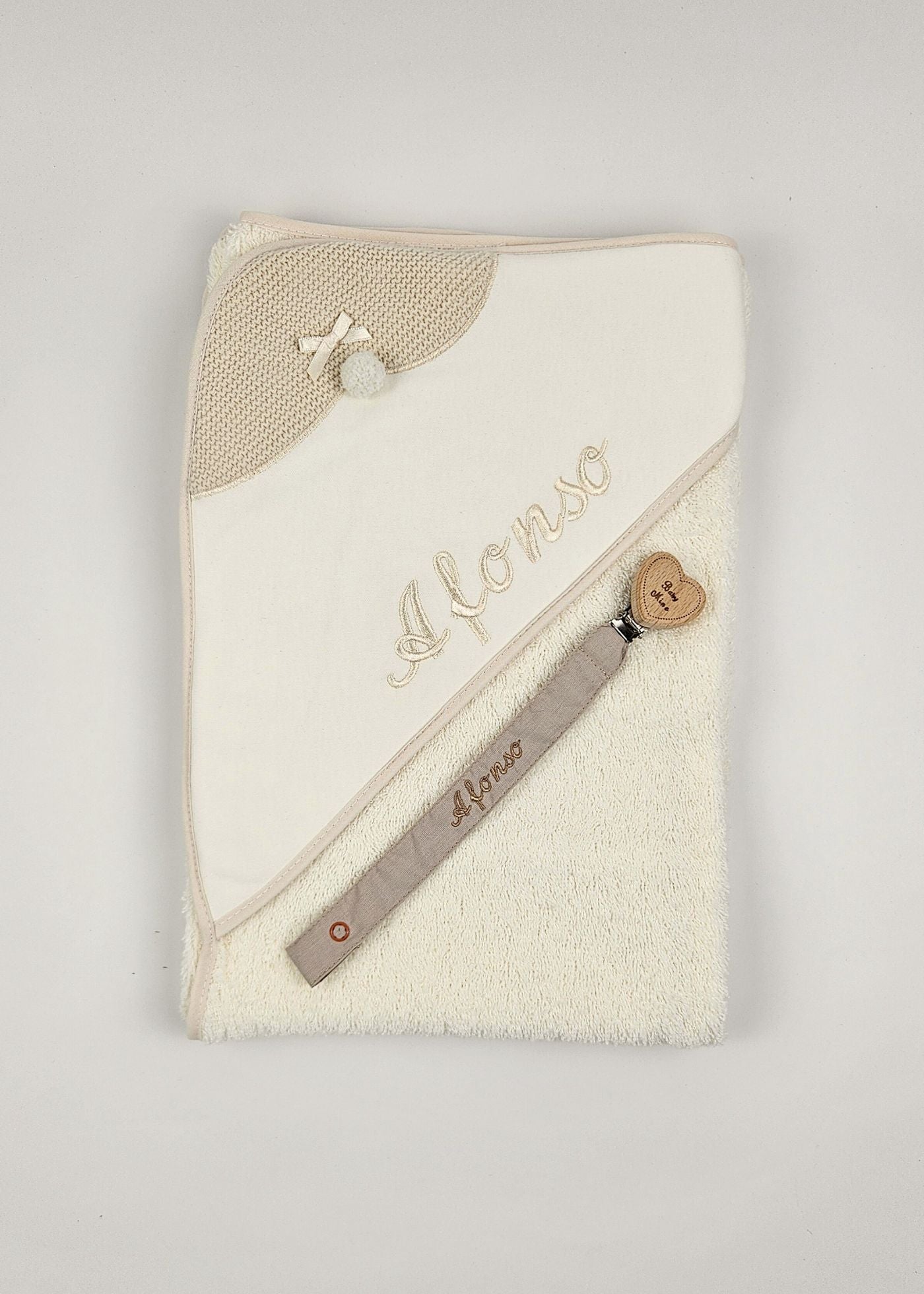 Este pack inclui toalha e prende chupeta, todos personalizados com bordado do nome do bebé, criando um conjunto único, prático e cheio de ternura.