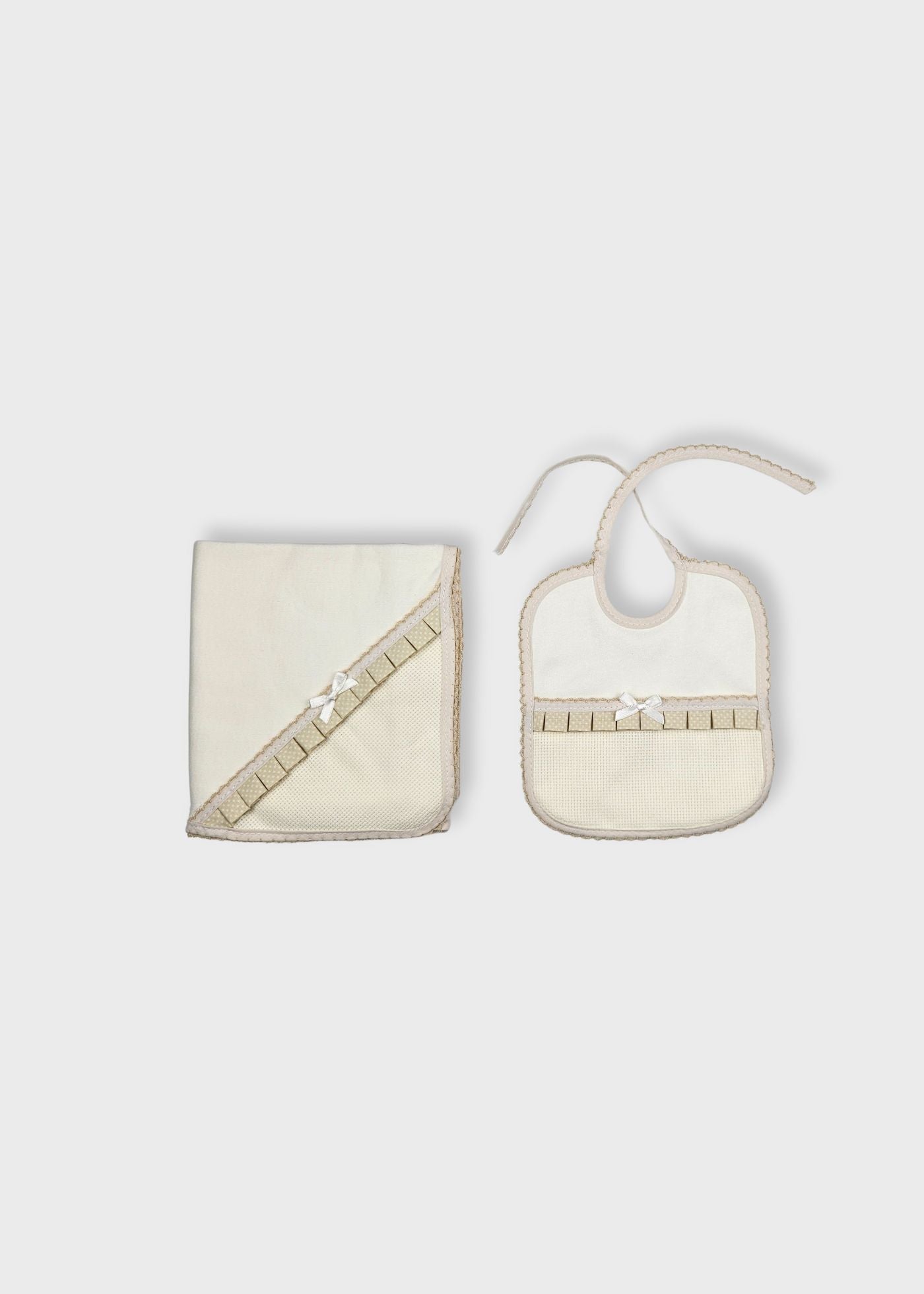 Babete em algodão, fio para nó, permite manter a babete confortável nos bebés. Babete em algodão com detalhe e laço, pode ser usada simples ou com bordado personalizado.