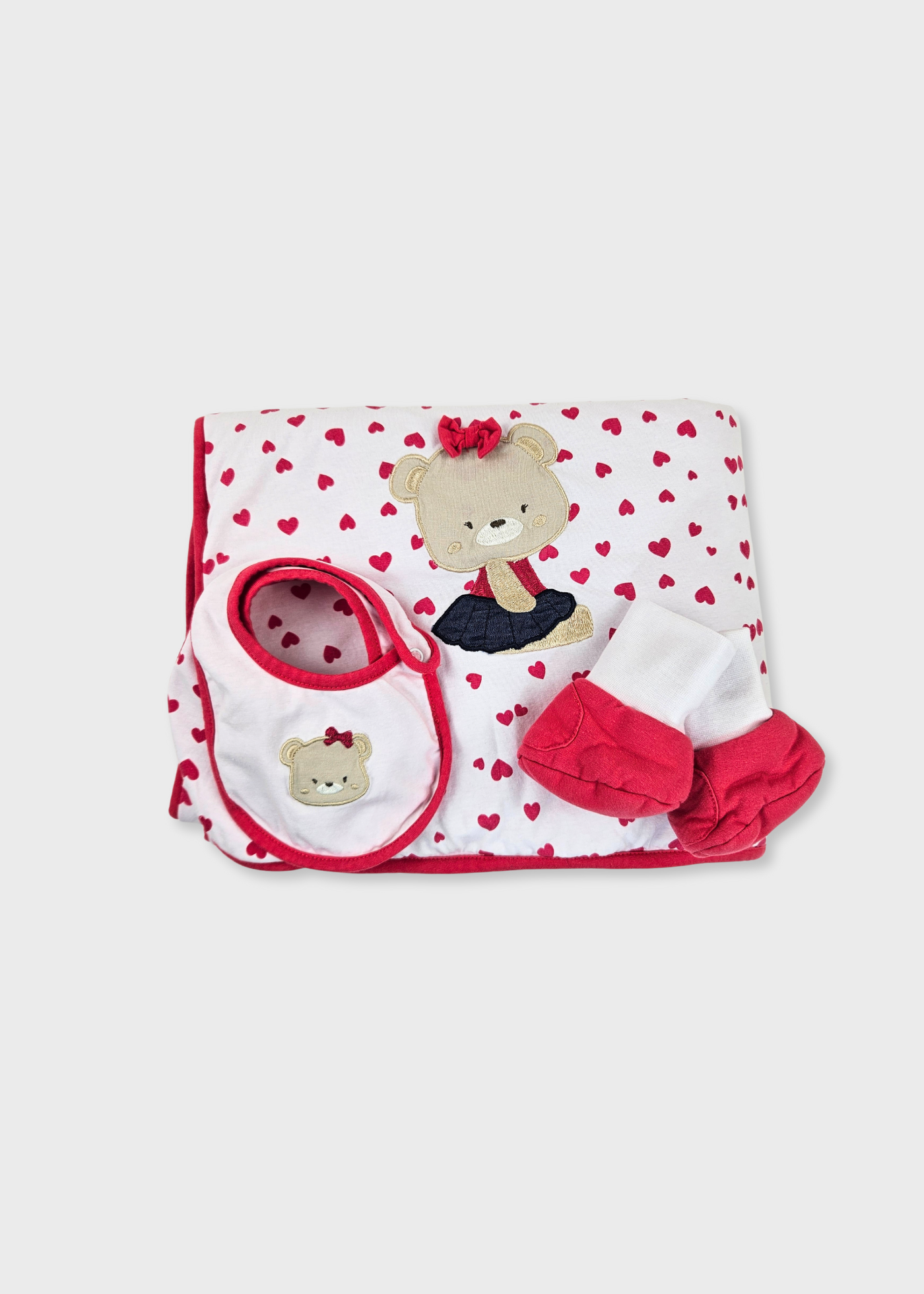 Conjunto 4 peças. 100% Algodão. Manta, carapins, duas babetes.